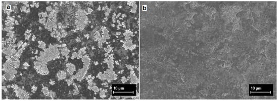 Field emission scanning electron microscope (FESEM) micrographs of copper dipped in (a) 1 M HCl and (b) 1 M HCl with 1000 ppm of inhibitor.