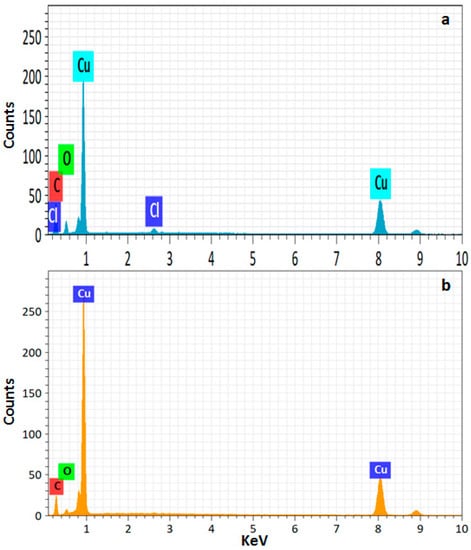Energy-dispersive X-ray spectroscopy (EDX) spectra of copper dipped in (a) 1 M HCl and (b) 1 M HCl with 1000 ppm of inhibitor.