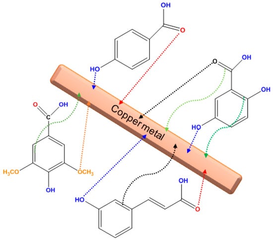 The anti-corrosive property of ginseng was confirmed due to the presence of phenolic compounds present in the extract, which are very active compounds adsorbed on the surface of the specimen, forming a protective film around the surface of the metal [70]. A thick, stable and well-bonded layer formed by the inhibitor was the reason for attaining higher efficiency at 1000-ppm concentration [26]. Due to high temperature, the stable compounds adsorbed on the surface are desorbed at some points and bring down the corrosion efficiency [71]. From SEM images, it was observed that without ginseng extract, the surface of the copper metal was seriously attacked by the HCl medium and formed severe roughness, pits and scratches. At the same time, a smooth copper surface without any damages was noted; due to the physical adsorption of ginseng extract molecules, a protective layer was formed over the metal surface and confirmed that the copper is well protected from corrosive ions. From the EDX spectra of copper metal after attack of HCl solution without inhibitor, it is noted that due to the surface contamination, there are some residual elements; C—7.13%, O—13.54% and Cl—1.01% were present on the surface of the copper specimen, which are more than that on the specimen with inhibitor, and there was no existence of Cl on the inhibited specimen. Presence of Cu is about 9% lower in the corroded specimen without the inhibitor because of removal of copper from the surface due to corrosion. Furthermore, 37% less O content represents that there was less oxidation in the inhibited specimen, which is the root cause for corrosion. The plant extract as a corrosion inhibitor formed a shielding layer on the metal surface which protected the copper from getting delaminated and removal of layer of metal surface. Furthermore, the presence of carbon and oxygen on the inhibited metal surface proves that the active chemical compounds are adsorbed on the copper surface by a synergistic effect and shows a higher inhibition efficiency. There are three ways of achieving adsorption—physical, chemical and combined [72]. Physical adsorption is nothing but the phenomenon of electrostatic interaction of protonated molecules with already adsorbed sulfur ions; chemical adsorption is the interaction between unshared electron pairs of oxygen atoms or π-electrons of aromatic ring copper surface (Figure 7). The inhibition process is executed, hindering the plant extract solution from forming a film around the metal surface, and by the action of adsorption, the available cathodic and anodic sites which activate corrosion are minimized [73,74]. The roughness and damage on the corroded copper specimen under the exposure of HCl medium are due to the absence of the inhibitor. In the presence of the inhibitor, it is very clear from the topography of the AFM image that there was no corrosion initiation and the smooth surface without any pits and damage confirms that the thin film that formed on the surface of the copper metal protected it from corrosion (Figure 7). The surface roughness value is high in the blank solution (329 nm), that is, in HCl medium without the inhibitor, because of the corroded surface of the copper metal, whereas the roughness value decreased to about 55 nm in copper exposed to same acid environment with the inhibitor which is 16.7% less than that of the uninhibited corroded specimen [75,76,77,78,79,80,81].
