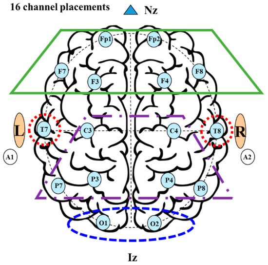 To measure the subjects’ EEGs during resting indoors, the EEG device (QEEG-64FX, Laxtha, Korea) was directly connected with the subject’s head. This is a high-precision multi-channel wide band biometric system with a three channels bipolar, and it can measure the biosignal by applying HPF, LPF, and Notch filters according to the target signal. The EEG measuring equipment used A2 as the reference electrode, and 16 channels were installed on the subject’s head, as shown in Figure 1. In general, both the left and right reference electrodes can be used, but, in some cases, the ECG signal can be mixed with some EEG signals when it is used at the left side. Therefore, the right earlobe (A2) was attached as the reference electrode in this study. The head was primarily divided into four parts to analyze the variation of EEG at different parts of the head, as shown in Table 1. In Figure 1, the frontal lobe zone is composed of prefrontal (Fp1, Fp2), left frontal (F3, F7), and right frontal lobes (F4, F8); the central lobe zone has the parietal (C3, C4, P3, P4), left parietal (P7), and right parietal lobes (P8). In addition, the temporal lobe zone has the left (T7) and right temporal lobes (T8), and the occipital lobe zone has the occipital lobes (O1 and O2). The uBio Macpa device, with a measurement range of 40–200 beats per minute (BPM) and a measurement error of ±2%, was also used to measure cardiac activity status.