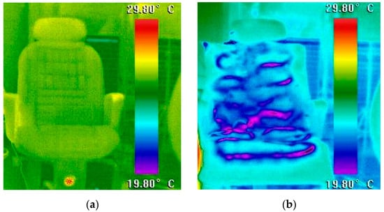 Infrared camera pictures of various cooling seats. (a) Ta = 27.5 °C/ventilation cooling seat. (b) Ta = 27.5 °C/cold water-cooling seat.