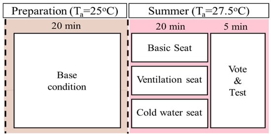 In this study, the basic, ventilation, and cold water-cooling seats were applied for indoor rest condition in summer. Figure 3 shows the experimental process and timetable. First, after EEG and cardiac activity status measuring equipment were attached to the subjects, they followed on to the preparation room at a temperature of 25 °C and stayed for 20 min to adapt to the indoor condition in summer. In sequence, experiment on biosignal changes was conducted in the test room at a temperature of 27.5 °C for 20 min. After a 20-min rest on the test seat, simple voting and attention-focused tests were conducted, as shown in Table 3. After the first experiment, the subjects stayed in the waiting room (25 °C) for 40 min of free activity. Then, they remained for 20 min in the preparation room at 25 °C to adapt to the indoor condition. Subsequently, the ventilation seat was applied in the test room (27.5 °C) and simple voting and attention concentration test was conducted for 5 min after a 20 min break. For the cold water-cooling seat, the same procedure was applied. Table 3 shows a questionnaire of seven thermal comfort points used in this study.