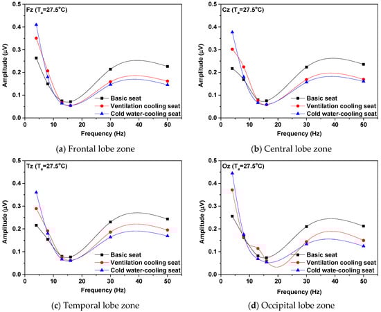 Figure 4 shows the average frequency of the subjects’ frontal lobe zone (Fz), central lobe zone (Cz), temporal lobe zone (Tz), and occipital lobe zone (Oz) during rest using the basic, ventilation, and cold water-cooling seats at 27.5 °C. The δ-wave (1–3 Hz) and θ-wave (4–7 Hz) components corresponding to 0–7 Hz were relatively activated in the frontal and occipital lobes. Moreover, it was confirmed that the average frequency was most activated when the cold water-cooling seat was used. An increase in the δ-wave activity in the frontal lobe zone, related to the mood control, and the posterior cortex, associated with signal processing was observed. The increase in the δ-wave activity indicated that the subject felt comfortable during rest using various seats, similar to the brain activity when the human is in a deep sleep. As δ-wave and θ-wave frequencies occur during sleep and drowsiness, it can be inferred that the use of the cold water-cooling seat provided an appropriate sleep and drowsiness environment to the subject during rest. The lowest values in the average frequencies of the brain were found in the sensorimotor rhythm (SMR) (12–15 Hz) and mid β-wave components (16–18 Hz) corresponding to 10–20 Hz in all areas. When the subject was resting, low values of SMR and mid β-wave average frequencies were obtained because these frequencies occur when the brain maintains concentration in an active state with positive thinking. After an intermediate frequency of 20 Hz, the average frequency of the brain gradually increased at high β-wave frequencies (20–30 Hz) and then slightly decreased at the γ-wave frequencies (31–50 Hz). In this study, the subject conducted a simple concentration test, such as performing office work before and after a break. Subsequently, because the subject sat in a chair and rested for a certain period, the stress caused by the subject’s office work affected the variation of brain activity. In all areas, the γ-wave activity of the ventilation and cold water-cooling seats decreased by 33.3% and 42.8%, respectively, compared to that of the basic seat. As a result of the experiment, the δ-wave frequencies, which are activated when taking proper rest, were most active when the cold water-cooling seat was used. The θ-wave frequencies, which commonly occur during sleep and drowsiness, were most active when the ventilation seat was used. However, the difference in the θ-wave frequencies between the cold water-cooling and ventilation seat in the temporal and occipital lobes areas was approximately 8%, which is significant. Therefore, the use of a cold water-cooling seat can provide a pleasant resting environment for the subjects.