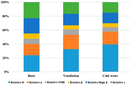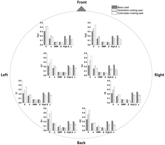Figure 5 presents a graph of the relative activity ratio of brain waves in the entire brain area when resting, using the basic, ventilation, and cold water-cooling seats at an indoor temperature of 27.5 °C during summer. Activation of θ-wave means that the subject is taking adequate rest, and the activation of SMR and β-wave increases when the subject is performing concentrated tasks. Activated relative θ-waves represented 23.9%, 32.7%, and 39.6% among brain waves when using basic, ventilation, and cold water-cooling seats, respectively. Therefore, it was confirmed that the relative θ-wave is the most activated among various brain waves. In the case of using the ventilation and cold water-cooling seats, the relative θ-wave increased by 36.8% and 65.5%, respectively, compared to that when using the basic seat. The proportion of the relative α-wave among brain waves was 15.9%, 20.5%, and 17.9%, when the basic, ventilation, and cold water-cooling seats were used, respectively. Moreover, when the ventilation and cold water-cooling seats were used, the relative α-wave increased by 28.9% and 12.5%, respectively, compared to that of the basic seat. When using the basic seat, the degree of EEG activation decreased in the following order: relative θ-wave, relative γ-wave, relative high β-wave, relative α-wave, relative SMR, and relative β-wave. In the case of using the ventilation and cold water-cooling seats, the following order was observed: relative θ-wave, relative α-wave, relative γ-wave, relative high β-wave, relative SMR, and relative β-wave. The relative SMR and relative β-wave are activated when maintaining concentration while learning or thinking, and showed the lowest activity during rest in this study. When the ventilation and the cold water-cooling seats were used, the activation of the relative α-wave was different from that using the basic seat. This indirectly indicates that the subject felt more comfortable during the rest and the external concentration was reduced in this state, compared to the case when the basic seat was used. In other words, ventilation and cold water-cooling seats provided a more comfortable rest, compared to the basic seat, in summer indoor spaces. Overall, the relative θ-wave, which is an indicator of sleeping and comfortable rest, was considerably activated, reaching a level of 39.6% when using the cold water-cooling seat. Therefore, the use of a cold water-cooling seat for resting was the most appropriate method to provide a suitable rest environment for the subjects.