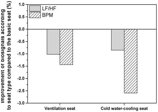 Figure 7 shows the improvement of biosignals according to seat type, compared to the basic seat, when the subject rests using the ventilation and cold water-cooling seats at 27.5 °C as the indoor temperature condition during summer. LF/HF, which indicates the degree of balance of the autonomic nervous system, is known to decrease, owing to the reduction of activity in the sympathetic nerve during sleep and the increased activity of the parasympathetic nerve. Compared to the use of the basic seat, LF/HF decreased by 1.02% and 0.85% when the ventilation and cold water-cooling seats were used, respectively. The BPM decreased by 1.44% and 2.59% using the ventilation and cold water-cooling seats, respectively, compared to that using the basic seat. The decrease in the subject’s BPM indicates a reduction in the contractile strength of the heart. Thus, it could be predicted that the subject’s body temperature decreased when the ventilated and cold water-cooling seats were used, compared to the basic seat. In a comprehensive analysis, the use of a cold water-cooling seat is considered to provide the most pleasant environment for the rest in indoor conditions.