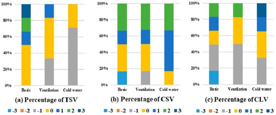 Figure 8 shows a comparison of the TSV, CSV, and CLV after rest using the basic, ventilation, and cold water-cooling seats at a temperature of 27.5 °C as the indoor temperature condition during summer. As a result of the TSV for the basic seat, 50% voted the neutral areas which are “warm” or “not cool,” and the remaining 50% voted for “warm,” “hot,” and “feel hot.” However, when using the ventilation seat, 50% of the subjects chose neutral, as in the case of the basic seat, and 33.3% and 16.7% voted “cool” and “warm,” respectively. When using the cold water-cooling seat, 71% of the subjects answered “cool,” and the other 29% answered in a neutral area. According to the analysis of the CSV, when the basic, ventilation, and cold water-cooling seats were used, the response rate for the comfort index 2 indicating satisfaction was the same for all three conditions. However, when ventilation and cold water-cooling seats were used, the comfort index was higher than 0 (neutral), and the average comfort level increased by 5.8% and 13.9%, respectively, compared to the basic seat. Among the three cases, when the subject was resting using the cold water-cooling seat, all subjects responded with a comfort index of 0 or a little higher, thus it was the most satisfactory condition regarding thermal comfort. This means that the use of the ventilation and cold water-cooling seats provided a comfortable environment to the subject for rest in the indoor space during summer.
