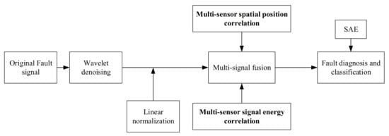 The organization of the rest of this article is as follows: The second part introduces the basic wavelet noise reduction theory, linear normalization method and Hilbert–Huang transform. The fourth part verifies the STMF method and the comparative analysis with other fusion methods, which verifies the superiority of the STMF method. The fifth part is the conclusion. The overall framework and ideas of the content in the article are shown in Figure 1. First, wavelet denoising was performed on the original fault data and a linear normalization method was used to standardize the data. Then, the data are fused and the weight is determined by the correlation of the multi-sensor spatial position coordinates and the energy correlation of each sensor. Finally, the SAE method was used to intelligently diagnose faults with the fusion fault data.