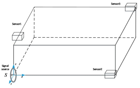 The established signal source and sensor position distribution diagram is shown in Figure 4. Assume that there is only translation, not rotation, between the three sensors. In the space coordinate system, the position coordinates of the sensors are known. The direction distance of X, Y, Z can be regarded as the X coordinate, Y coordinate and Z coordinate of the three sensors. The spatial coordinates of three sensors are established to find out the spatial position correlation.