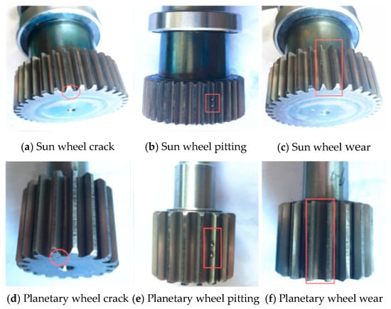 The types of bearing faults are shown in Figure 7, including 0.6 mm cracks in the inner ring and 0.6 mm cracks in the outer ring of the bearing. The gear fault types are shown in Figure 8, including planetary gear crack fault (1.2 mm, 3.6 mm), planetary gear pitting fault (3.6 mm), and planetary gear wear fault (1.2 mm, 3.6 mm). Taking the center position of the bottom of the bearing seat as the origin, the spatial coordinate system is established. The establishment of the space coordinate system of the test bench is shown in the red line part of Figure 6b. Sensor 1 and sensor 2 are respectively placed on the left and right bearing seats in Figure 6a, as shown in Figure 6b for specific positions. The coordinates are [0,0,20] and [40,0,20]. Sensor 3 is placed at the spatial coordinates [15,0,0] in centimeters. Unit of measurement: cm.