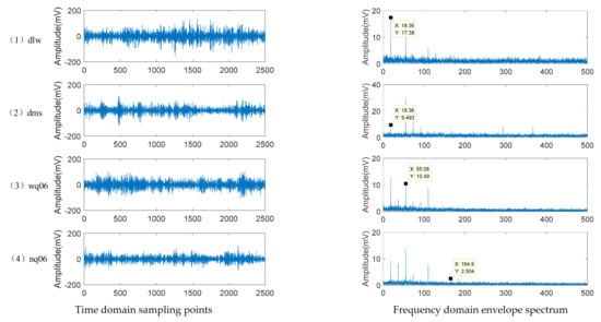 Therefore, the time domain signal is mapped to the frequency domain through the HHT, and then the envelope spectrum of different faults is obtained, which can clearly see the difference of different faults. According to the test data at 1300 rpm, the planetary gear crack fault (3.6 mm) and wear fault (3.6 mm), 0.6 mm cracks in the inner ring and 0.6 mm cracks in the outer ring of the bearing, and the time domain diagrams and frequency domain envelope spectra of the four faults are shown in Figure 9. Among them, the horizontal axes of the time domain sampling point graph reveal the number of sampling points, the horizontal axes of the frequency domain envelope spectrogram reveal frequency (Hz), and the longitudinal axes of both reveal the amplitude (mv).