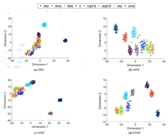When the fault data are verified, the fault type has normal data (n), bearing fault, planetary gear fault. The types of bearing faults are included 0.6 mm cracks in the inner ring (nq0.6) and 0.6 mm cracks in the outer ring of the bearing (wq0.6). The types of planetary gear fault include planetary gear crack 1.2 mm fault (dlw), planetary gear crack 3.6 mm fault (xlw), planetary gear pitting fault 3.6 mm (6ds), planetary gear wear 1.2 mm fault (xms), planetary gear wear 3.6 mm fault (dms). In Figure 10, Figure 11, Figure 12 and Figure 13, the dimension1 of the horizontal coordinate refers to the fault feature 1 after dimensionality reduction, and the dimension 2 of the longitudinal coordinate refers to the fault feature 2 after dimensionality reduction.