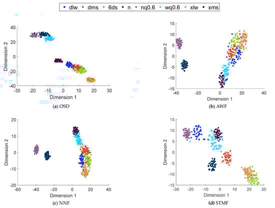 The classification effect of OSD is average, and several types of faults are clustered together under the working condition of 900 rpm. The aggregation degree of each fault in the AWF method is relatively poor, and the classification results of several faults are not very good; only xms and nq0.6 are separated from other faults. In NNF, the four types of fault classification results of planetary gear cracks (1.2 mm and 0.6 mm) and wear and bearing inner ring cracks of 0.6 mm are poor, all of which will affect the accuracy of the final fault diagnosis.