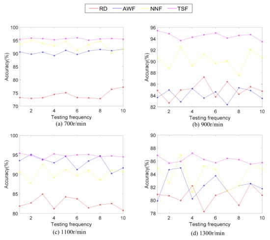 In Figure 14, the diagnostic accuracy of STMF data is the most stable under different speed conditions, and the overall accuracy of OSD is low. The fault diagnosis accuracy and volatility of AWF and NNF will vary with speed conditions. In short, the STMF method has good adaptability and accuracy.