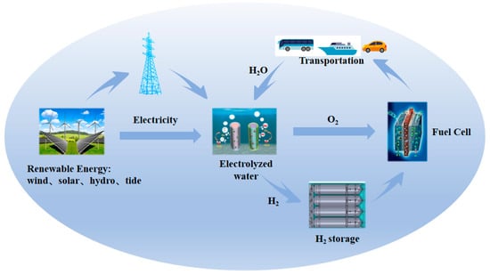 Searching for sustainable, clean, and highly efficient energy is the main method for solving the energy crisis and environmental pollution problems brought about by the first and second industrial revolutions, which have built a modern and prosperous society based on carbon-based fuels [1,2,3,4]. Human actions have led to the carbon dioxide content in the atmosphere rising rapidly and exceeding 400 ppm currently, mostly originating from the burning of coal, oil, and gas [2,5]. The application of wind and solar power and other types of renewable electricity generation technologies seems to be an efficient way to fulfill the requirement of an energy revolution [6,7,8]. However, they are strongly intermittent in nature due to diurnal or seasonal variations [9]. Converting their energy to a zero-emission chemical energy carrier such as hydrogen is an alternative that can achieve versatile utilization, such as clean heating or electricity at a later stage, on account of the high energy density of hydrogen [5,10,11,12]. Therefore, an increasing number of sustainable pathways for energy conversion and storage technologies, including water electrolysis, batteries, and fuel cells, have been proposed and extensively investigated [5,13,14,15]. Proton exchange membrane water electrolysis (PEMWE) operating in acidic environments has offered an effective way to produce sustainable, high-purity hydrogen through targeted electrochemical reactions since the 1960s [16] (Figure 1). PEMWE has the advantages of a faster dynamic response, a higher current density, and lower crossover of gases and is considered to be the basis of a hydrogen society in the future [17,18,19].