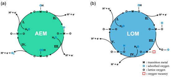 Diagrammatic sketch of (a) the AEM mechanism proposed by Rossmeisl et al. and (b) the LOER mechanism proposed by Rong et al. [24].