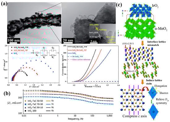 (a) Low- and high-magnification transmission electron microscope (TEM) images, a Nyquist diagram, and the steady-state polarization curve of the IrO2/Sb-SnO2 catalyst [37]. (b) Bode plot from the electrochemical impedance spectroscopy (EIS) of TaC-supported IrO2 [79]. (c) Diagram of the process by which the α-MnO2 substrate induces the lattice strain of IrO2 [45].
