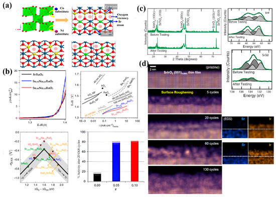 It should be mentioned that different kinds of crystal structures have a significant impact on the OER performance. It was proposed that monoclinic SrIrO3 underwent less surface reconstruction than the pseudocubic SrIrO3 owing to the better thermodynamic stability during OER tests in an acidic electrolyte [90]. Strong Ir–Ir metallic bonding and Ir–O covalent bonding in monoclinic SrIrO3 together induced its high structural and compositional stability. Only about 1% of the leached Sr was detected after 30 h in a chronopotentiometry test, which was much less than that (24%) from the pseudocubic SrIrO3. Additionally, Zou et al. put forward another way to decrease the cation leaching and surface reconstruction of pseudocubic SrIrO3 in acid media. They prepared pseudocubic, low-Ir-containing SrIrxTi1−xO3 perovskite oxides with 0 ≤ x ≤ 0.67. The inert Ti sites in pristine SrTiO3 were activated by Ir-substitution and showed remarkable OER activity with a reserved crystal structure of Ir-SrIrO3 during OER cycling [91].