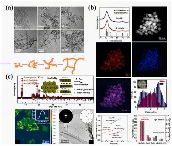 (a) TEM images and a schematic illustration of Ir nanowire intermediates obtained at different reaction times from 5 min to 20 h [62]. (b) Fine-structure characterization of a Ru@IrOx catalyst and investigation of its OER electrocatalytic activity [99]. (c) Fine-structure characterizations of ultra-thin NaRuO2 nanosheets including the crystal structure, an atomic force microscopy (AFM) image, a TEM image, and selected area electron diffraction (SAED) patterns [100].