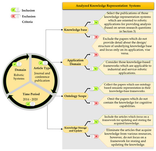 As a subject of study, in Section 3 on the analyzed knowledge representation systems, we considered the ontology-based knowledge representation of ten systems in the domain of robotics for comparison, published from 2014 to 2020. We included only those articles that satisfied all the inclusion criteria in the scope of our review for knowledge representation (Section 3), as described in Figure 2. The articles that did not match even with a single inclusion criterion were excluded.