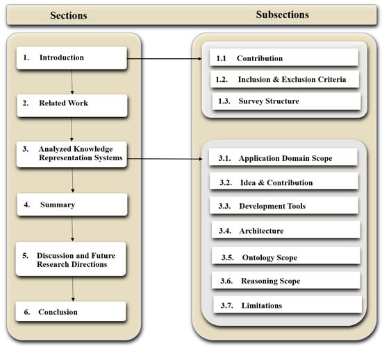 This article is organized in a top-down manner. The entire structure of our survey with related topics and subsections is diagrammatically demonstrated in Figure 3, which provides a quick overview of the topics discussed in our survey. In Section 3, we investigate ten different ontology-based knowledge representation systems (KRS) based on seven dimensions and highlight the research gap by discussing their limitations. Consequently, in Section 4, we discuss current research challenges and future research directions. Finally, we conclude our survey with a summary in Section 6.