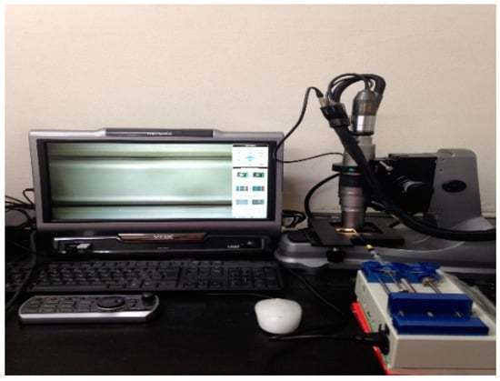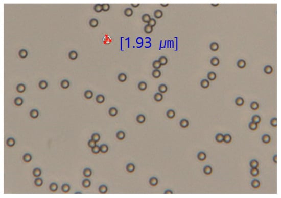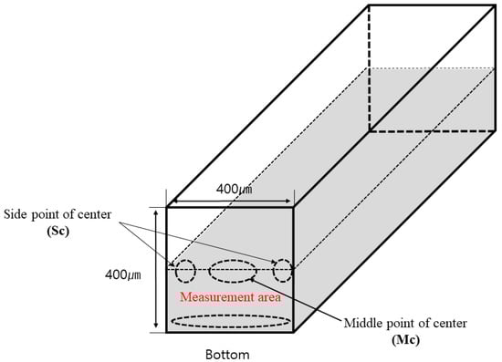 Contaminants were made based on the soil pollution standard of 6000 ppm indicated in the Environmental White Paper [22] for heavy copper metal contaminants, and the pH was divided into 4, 6, 8, and 10 for acid and basic conditions. The inflow velocity was injected consistently using a silage pump. The inflow velocity into the capillary tube was applied 1.0 × 10−3 cm/s considering the pH conditions, and 0.1 M of HCl and 0.1 M of NaOH were used for pH control. The conditions for each experiment are shown in Table 1, and the experimental equipment and microparticles are shown in Figure 1 and Figure 2. The tube was injected with a mixture of copper and particles, and the flow velocity was measured. A square capillary tube was used to analyze flow characteristics, and a square capillary tube was observed in half as shown in Figure 3. Since the square capillary tube was used, it was symmetrical up and down. The half-section area was observed, and the flow of microfluids was measured using microparticles by observing 3 parts for the bottom and center of the side and central part of the capillary tube. Three microparticles were selected using a video taken with an optical microscope. Using the video program, the moving distance of the microparticles was calculated after a certain period of time.