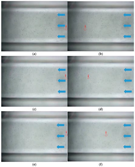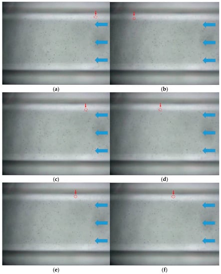 Experimental results of flow characteristics of copper contaminants–capillary tube side of center: (a) Particle position before moving 1; (b) particle position after moving 1; (c) particle position before moving 2; (d) particle position after moving 2; (e) particle position before moving 3; (f) particle position after moving 3.