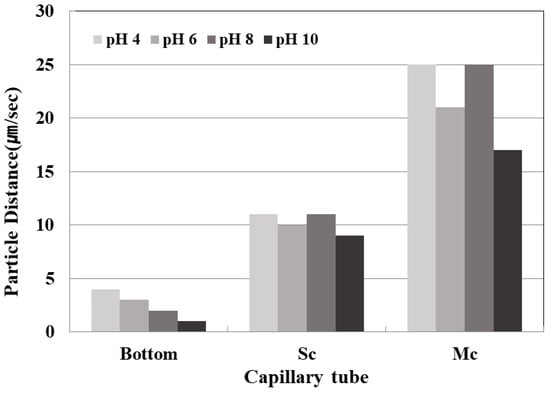 The flow velocity was measured in the same way as pH 4 in Section 3.1.1. As a result of observing the movement of three particles over time after the start of the experiment, it was found that the movement distance of the microparticles slightly decreased compared to the case of pH 4. In the capillary tube side of center and middle of center, the travel distance of the central side of the capillary tube is about 10 μm/s and the center is about 21 μm/s, which is slower than pH 4. In addition, the capillary tube bottom confirmed that the movement distance of microparticles at the bottom was about 3 μm/s.