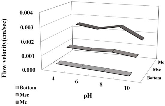 The flow velocity was measured in the same way as pH 4 in Section 3.1.1. The moving distance of microparticles at the bottom was confirmed to be about 1 μm/s, and the side and center of the central part in the capillary tube were about 9 μm/s and about 17 μm/s. These results indicate a tendency for the distance traveled to decrease as pH increases.