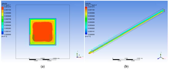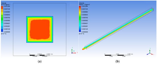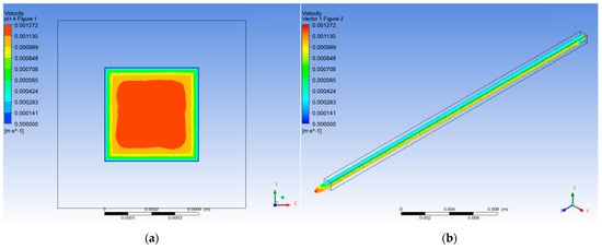 In the hydrophobic coated square capillary tube, the microfluidic flow according to the pH did not change at pH 4, pH 6 and pH 8, and it was confirmed that the speed decreased slightly at pH 10. Table 3 shows the flow rate at the center, which is the fastest among the speeds in the capillary tube among numerical analysis results, and it is possible to confirm the flow rate slower than the experimental results. The following Figure 10, Figure 11, Figure 12 and Figure 13 show the result of numerical analysis of flow velocity and vector of square capillary tube through numerical analysis.