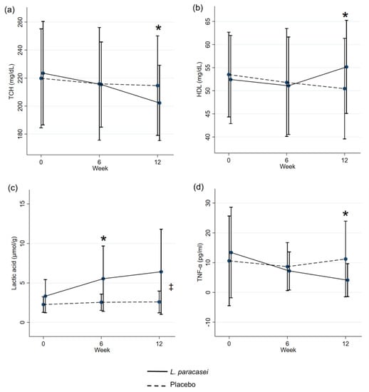 3.2. Effect of L. paracasei Supplementation on Cholesterol, Oxidative Stress, and Biomarkers at Baseline, 6 Weeks, and 12 Weeks