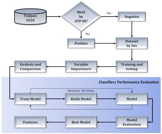 Initially, the parameters of the biochemical evaluation, as well as the anthropometric factors: waist circumference, systolic and diastolic blood pressure, glucose, high-density lipoprotein cholesterol (HDL), and triglycerides, in order to identify and classify participants with MetS based on the definition that was established by the NCEP ATP III. Once the participants have been classified as positive and negative concerning the MetS, the input dataset for the learning algorithms is generated, being composed of categories related to clinical and anthropometric parameters and habits, like alcohol consumption, smoking, physical activity, dietary, and quality of sleep.