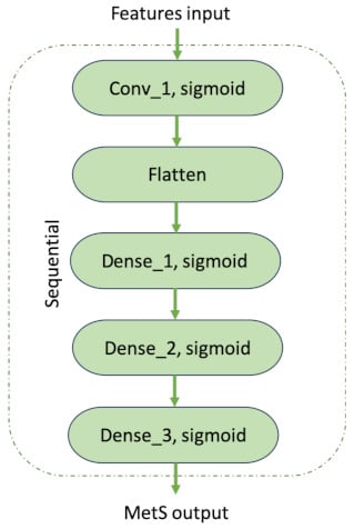 The basis for the development of deep learning is ANN, that through the connection among many hidden layers, can learn features to train the model []. In this work, Keras was used []; this model is based on a sequential class; it means that the network is created layer by layer. Only the dimension for the first layer corresponds to the number of features; then, the hidden layers’ dimension is deeply connected to the neural network. The first layer consists of a convolution network with an input shape of seven (features selected); after the first layer’s output is flattened, the purpose is to only have one dimension in the shape output. The third layer is a dense network with a dimension of 8, another dense network (dimension = 8) is added; finally, the last layer is a dense network; all of them have a sigmoid function for activation. Figure 2 shows the general configuration for the deep neural network implemented. The training parameters were a learning rate of 0.0001 and 2500 epochs with Adam optimization. The parameters were selected according to proof of good performance.