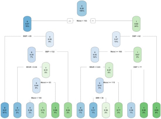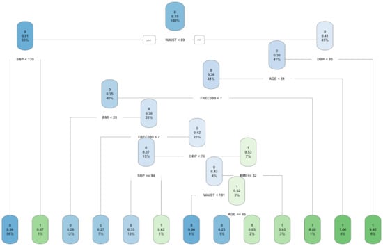 The relevant variables that were found by the Chi.Square filter method, both for women (Table 1B) and for men (Table 2B), were used to create predictive models with the C4.5 classifier to compare them with the models that were created with Deep Neural Network and Random Forest. Furthermore, C4.5 has the advantage of creating a model that is interpretable to the naked eye by a person. In Figure 3, we present the best model for women and in Figure 4, the best model for men, both being found over 30 independent runs using the train set. Classification trees have the property of making an embedded variable selection during the predictive model creation process. In the case of women, the variables that were selected for the construction of the tree were WAIST, SBP, DBP, AGE, BMI, and FREC080. For men, the variables selected for the construction of the tree were WAIST, SBP, DBP, WhtR, and BMI.