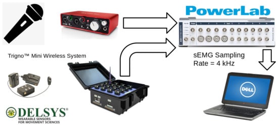 This section describes the subject characteristics, data collection protocol, and system setup used in this study, as illustrated in Figure 1. The equipment was installed in a soundproof booth (IAC Acoustics, North Aurora, IL, USA) and included: (1) a base station and four wireless Trigno™ mini sEMG sensors with a bandwidth of 20 Hz to 450 Hz (Delsys, Natick, MA, USA); (2) a head-worn microphone (AKG, Model C520, Vienna, Austria); (3) an audio interface (Scarlett 2i2, Focusrite, High Wycombe, UK); and (4) a data acquisition device (PowerLab 16/35, ADInstruments, Dunedin, New Zealand), which performed the synchronized sampling of audio and sEMG signals using LabChart v. 8.1.10 for MS Windows. The sampling rate was set to 4 kHz for the sEMG signals and 20 kHz for audio, both with 16-bit quantization. In addition, audio signals were collected using the software Audacity(R)© v. 2.1.1 for recording and editing, at a sampling rate of 44.1 kHz and 16-bit quantization. In this study, we focused on classification using only the sEMG data for vowel productions, but the audio signals were important to determine the sEMG ROI’s, as explained subsequently.
