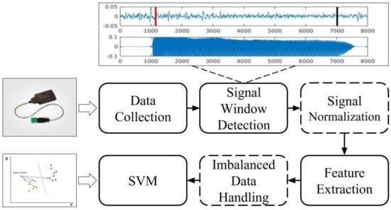 The steps taken by the classification system used in this study are summarized in Figure 3. The ROIs for the sEMG signals were determined using a window detection algorithm applied to the audio signals (top portion of Figure 3). Then, the system extracted seven different time-domain features from the observed sEMG ROIs, in addition to the GUSSS ratios [13], which measure the degree of presence of previously learned sEMG patterns within the observed sEMG signal. Then, a support vector machine (SVM) was employed for classification due to its elevated performance in non-linearly separable 2-class problems. The remaining steps of the system, such as signal normalization and imbalanced data training, are also represented in Figure 3 and will be further discussed in Section 4.