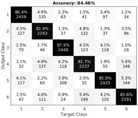 For the first experiment, we used all vowels as individual gestures: i.e., /a/, /u/, and /i/; each produced under normal or simulated pressed conditions. Thus, a total of six classes were created, each with 50–55 valid samples due to a few occasional misarticulations or misses. The classification results are shown in the confusion matrix in Figure 4. The confusion matrix was arranged so that the normal and corresponding simulated pressed gestures are next to each other—i.e., the indices (row and column) of the matrix correspond to: (1) /a/ normal; (2) /a/ pressed; (3) /u/ normal; (4) /u/ pressed; (5) /i/ normal; and (6) /i/ pressed. Hence, the reader should notice that error in the amount of about 5% of the cases relates to the confusion between the normal and their corresponding simulated pressed vowels—i.e., six of the second-diagonal elements with indices of (1,2) or (2,1); (3,4) or (4,3); and (5,6) or (6,5). The remaining approximate 10% of the error is spread through the remaining elements on each side (upper and lower halves) of the confusion matrix.