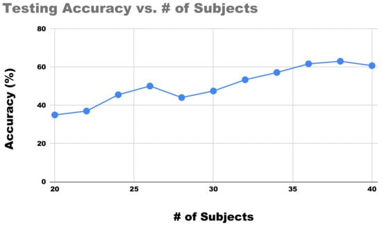 As mentioned in Section 4.1, the trained classifier did not satisfactorily generalize with respect to the left-out subjects—having an almost perfect validation accuracy while yielding a lower testing accuracy. As pointed out, one potential reason could be the lack of diversity on training data to provide a big enough learning space for vocal fatigue. The results from Section 4.2.1 also indicated that although more features could lead to better validation accuracy, it aggravated the issue with the generalization. So, in order to investigate the influences of sample sizes we repeated the experiment in Section 4.2, but this time varies the amount of used subject pairs in each experiment from 20 to 40. The classification results were plotted in terms of their testing accuracy in Figure 5. These results demonstrated a clear linear relationship between the total amount of training data being used (as adding the subject pair) and the resulting accuracy. Evidently, if more than 40 pairs were available, the results would further improve.