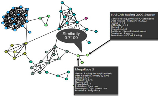 The dataset used for this research was collected from GameFAQs.com on 24 April 2019. It consists of 63,952 games with English titles from 1985 to 2019. We performed some preprocessing by removing the games that were not rated at all and were left with 36,696 games. Next, we defined the relationship between each data (node) using similarity calculations. Defining similarity is one of the important key points in graph drawing, as different similarities will provide different results for an undirected graph. The higher the value, the more similar the two nodes are. Equation (1) shows how we define our similarity function.