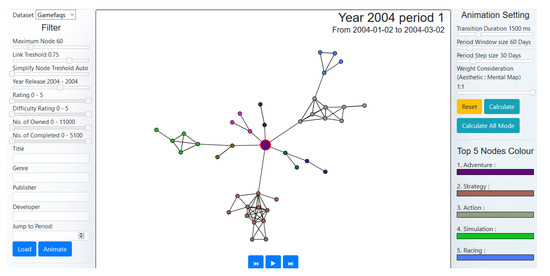 Through the web application, a user can filter the data he/she wants to be drawn and fully control the animation, including play, pause and choice of the next or previous periods to be shown. Most of the calculation of the node positions is done on the server side, which will then be stored in our database. Figure 4 shows our front-end interface where a user can filter data, such as the number of displayed nodes; the threshold for similarity link and algorithm simplicity; the year of release; user ratings; difficulty ratings; number of people owning the game; number of people who completed the game, a text-based filter for the title, genre, publisher and developer of the game and, also, the set period window size and its step size on the animation set before performing the animation calculation. Smaller period window sizes mean lesser nodes in each period, while a smaller step size gives minor visual changes during the animation.