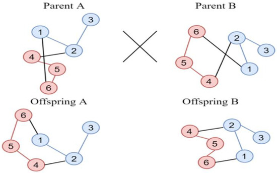 Choosing a desirable crossover operator in graph drawing is hard. Here, a desirable crossover should generate an offspring that is similar to its parent. Our crossover operator, called single-link crossover, will exchange a chain of connected points, thus inheriting characteristics much better than only exchanging a single point. As shown in Figure 6, both offsprings obtained a much better fitness value as they reduced the edge-crossing while still maintaining some characteristics from their parents.