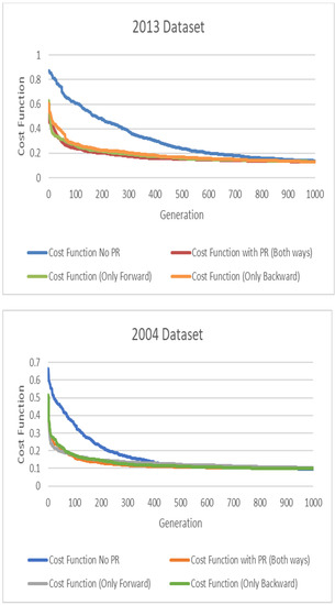 Figure 9 shows the best fitness value in each generation for datasets 2004 and 2013, respectively. In every experiment, those using PR always converged much earlier than those without PR, as we can see from the curves on both graphs. However, once they reached convergence, using PR gave no better results than the ones without PR, and all of the experiments reached roughly the same results. We concluded that using PR gives a considerably faster convergence rate but not better results from these experiments.