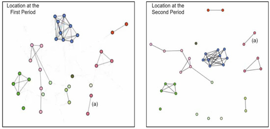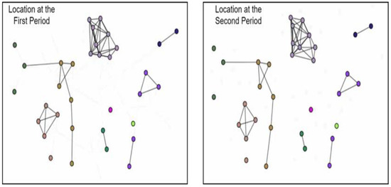 Our mental map cost is based on what Bridgeman and Tamassia [16] proposed, which is shown in Equations (8)–(10). Although there are many similarity measurements, we only use ranking, nearest neighbor within and nearest neighbor between. Using only these three measurements is good enough to preserve a mental map while not necessarily fixing the overlap node positions between two periods. As our main purpose is to create a smooth transition between two graphs—that is, between our previous graph and our current graph —we only measured based on the node that exists in both periods.