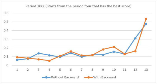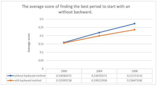 In our experimental results, we found that, by considering all possible starting periods (by spending n times the time that starts from the first period, where n is the number of periods), the system can look for the best period to start with, i.e., it is not always needed to start with the first period. Figure 13 shows the score (cost) in each period (two months) in 2000, and as we can see, the best score with the backward method (i.e., to consider all the possible cases) is in the fourth period. Figure 14 shows the comparisons in three different years (2000, 2004 and 2008) with and without the backward approach to explain how the best score is essential to get the best period to start with.