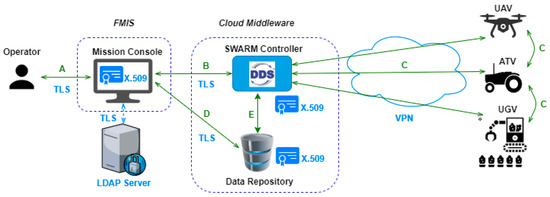 - Communication channel D: mutual authentication of the SWARM Controller and the Data Repository would be guaranteed by the X.509 certificates installed at both ends. This communication channel is used to record all user actions (e.g., agricultural missions for vehicles). Tracking of user actions would be guaranteed as the Mission Console uses the specific credentials of each user (i.e., the ones validated by the LDAP Server) to access the Data Repository. This information is duplicated in the log files recorded by the Mission Console;