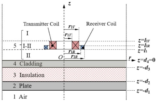 Figure 1, a ferromagnetic plate with an insulation and a cladding is modeled as a four-layered structure for simplicity. Layers from bottom to top represent the air, the plate, the insulation, and the cladding, successively. The layer over the cladding is layer 5, and it is divided into three subregions. The sensor consisting of transmitter and receiver coils with rectangular cross-sections is in section I-II.