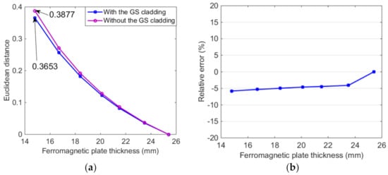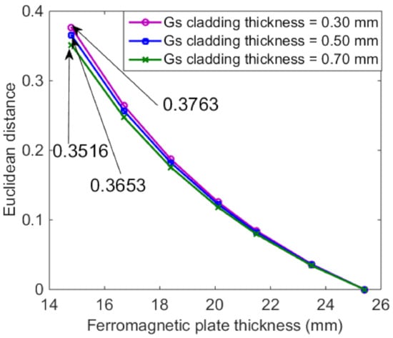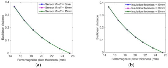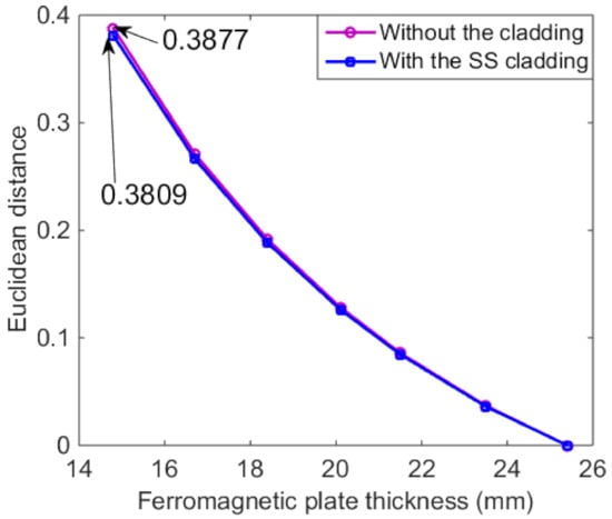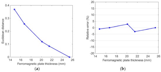 Substituting the Euclidean distances of the detection signals into Equation (17), the calculated thicknesses are 23.6 mm and 18.3 mm, respectively. The relative errors between calculated and real thicknesses are 0.42% and 0.54%, respectively. This indicates that the feature is feasible for the ferromagnetic plate thickness assessment.