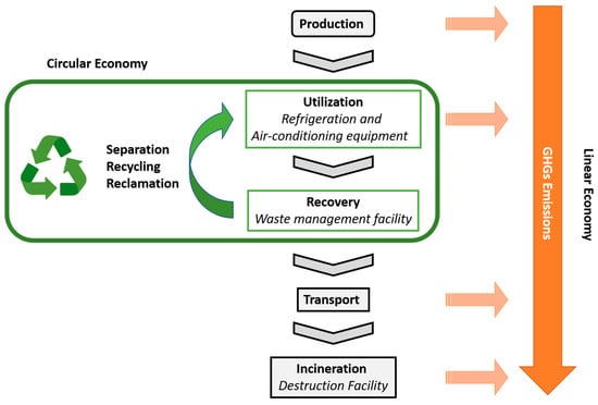 Possible approaches for the management of F-gases, following either a linear economy concept (from production to incineration) or a circular economy concept (involving separation, recycling and/or reclamation processes).