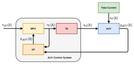 The proposed control system structure is shown in Figure 2. The nonlinear AUV system, including sensors and actuators (blue block) as described in the previous section, is affected by the tidal current (green block) speed and the control system (grey block). The controller is composed of three main algorithms: a predictive control algorithm, an estimator and an allocation algorithm.
