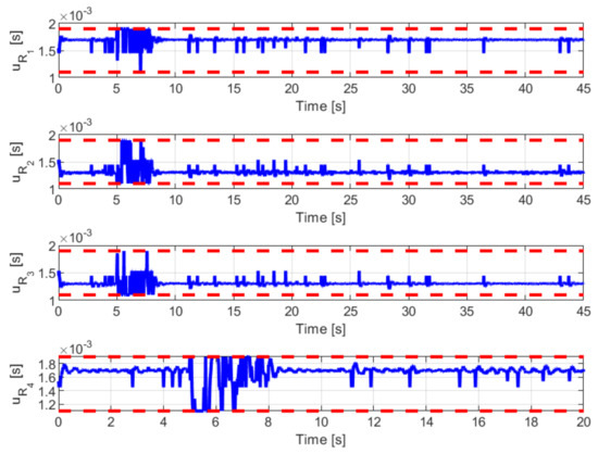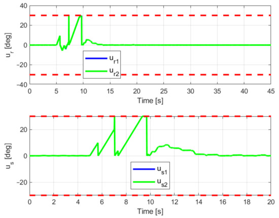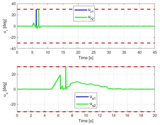 Figure 10 shows the fin control signals. Compared to the previous fin controls, the stern plane signals are particularly affected by the tidal current, due to their effect on the AUV dynamics. Finally, in Figure 11 and Figure 12 the side thrusters’ performance is shown. In this control scenario, the constraints are satisfied, and the control signals accommodate the saturation and backlash. The stabilization of the vehicle in the docking position satisfies the design specifications, with limited oscillations within the accuracy range of the sensors.