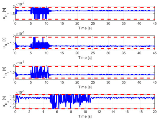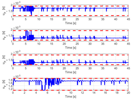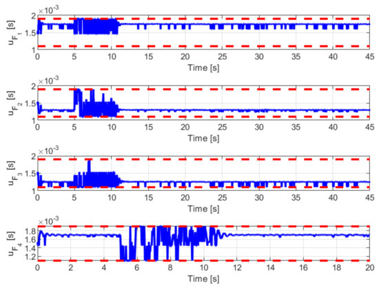 No current test: rear side thrusters’ control signals (blue plot) with respect to the saturation values (dashed red plot).